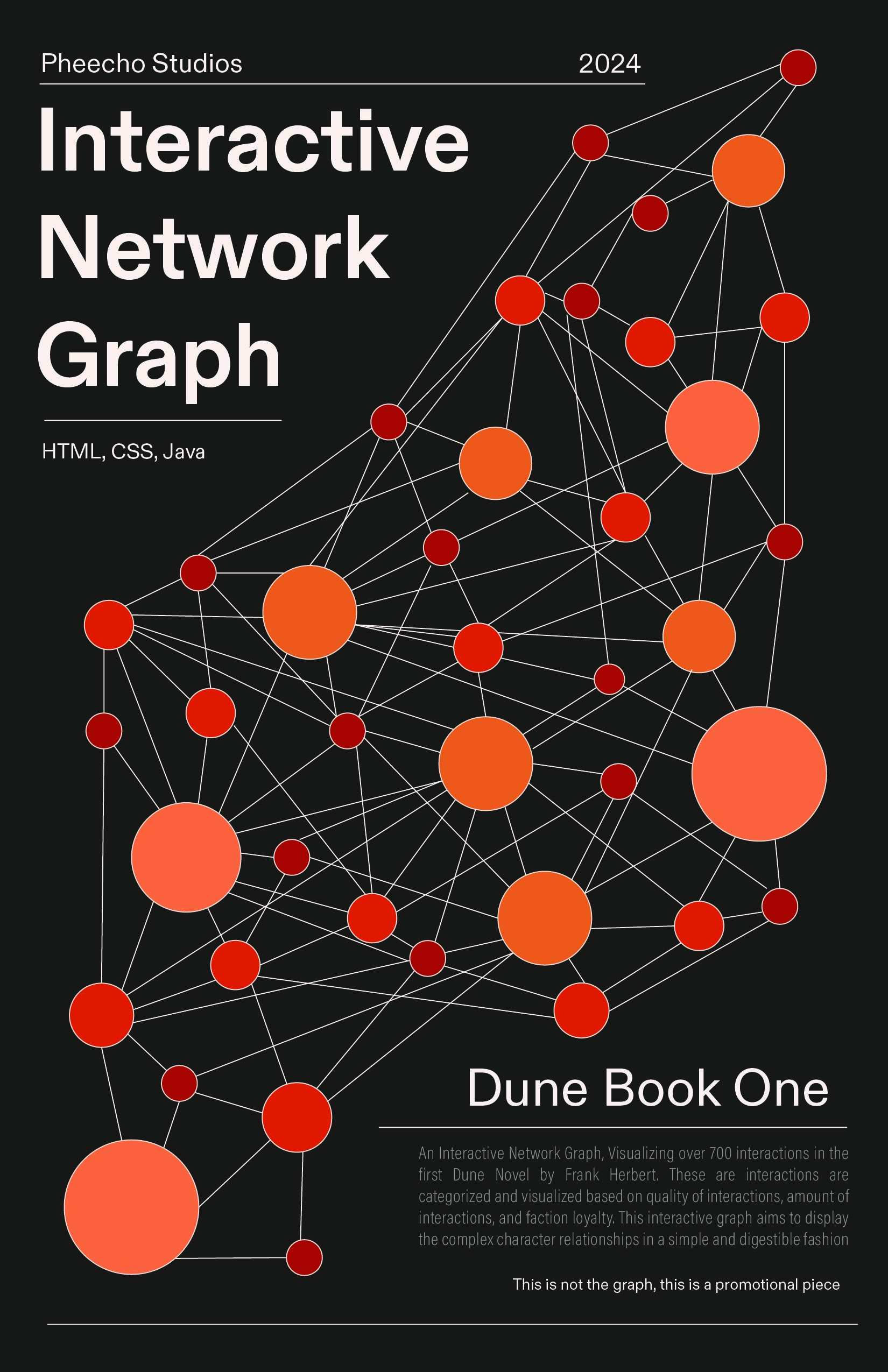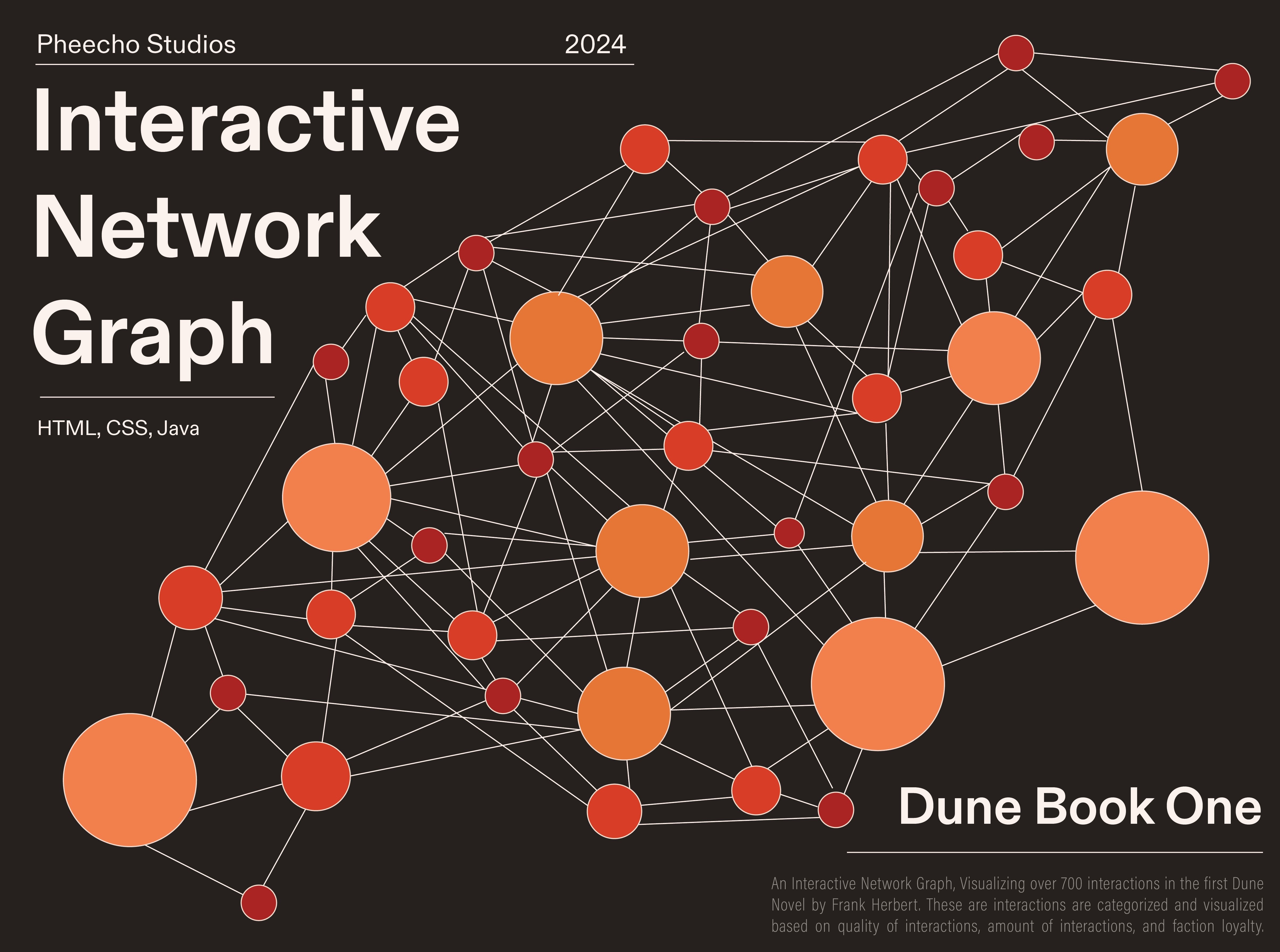 The final product consists of an interactive graph system, featuring a character description tab that appears when a user clicks on a character's dot. A legend and search feature are also included for ease of navigation and reference. Though the design is relatively simple, the system is fully automated using JavaScript, allowing for seamless integration of additional data. This means that, should the project be expanded to include characters and interactions from the other Dune novels, new data can be imported into the system without disruption, and it will automatically adjust and incorporate the additional information into the existing framework.