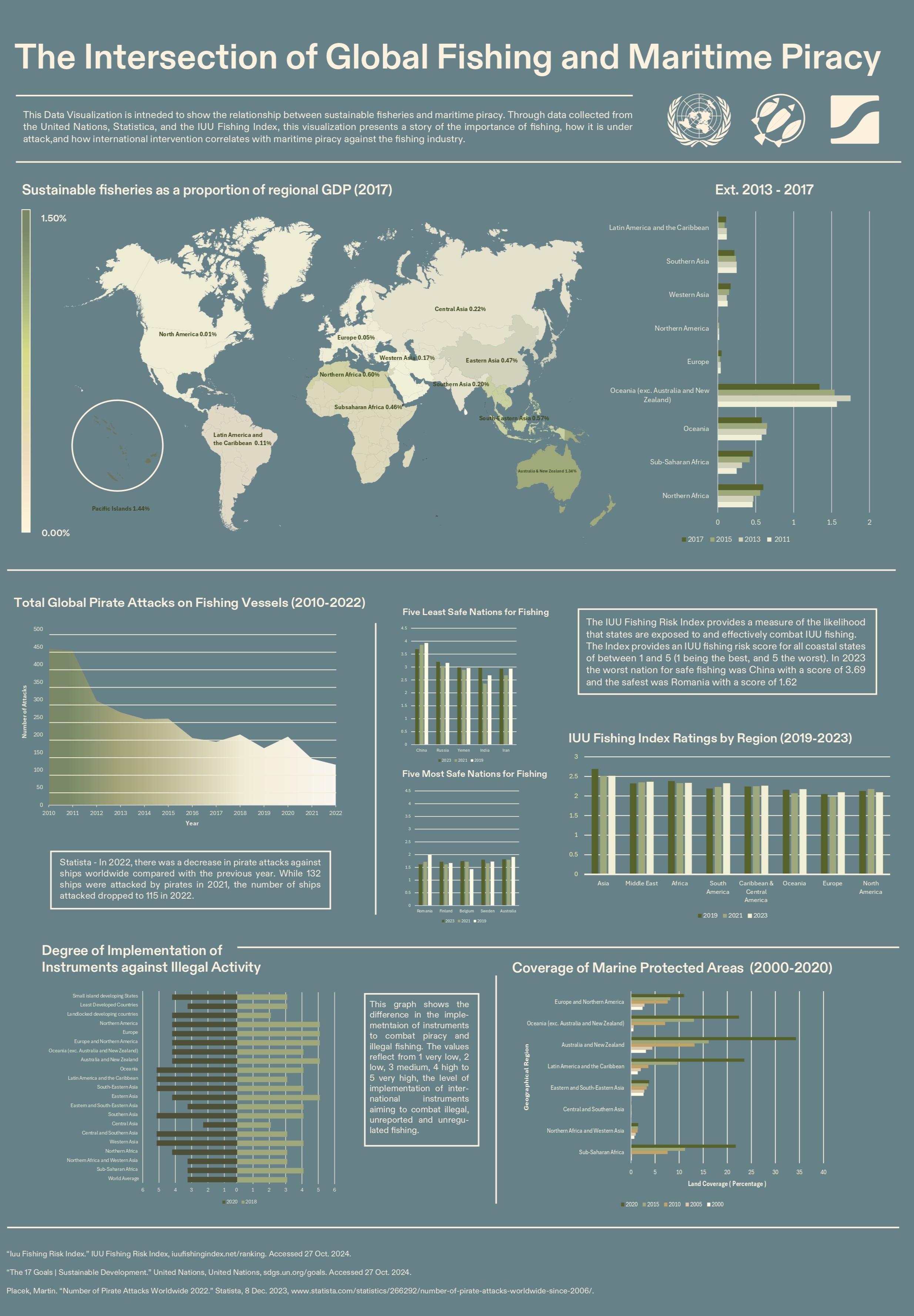 This project is a Data Visualization on Fishing and Piracy in regards to the 2024 sustainability goals of the United Nations. The Data is meant to present a storyline about how international and maritime fishing law effects piracy and illegal fishing.