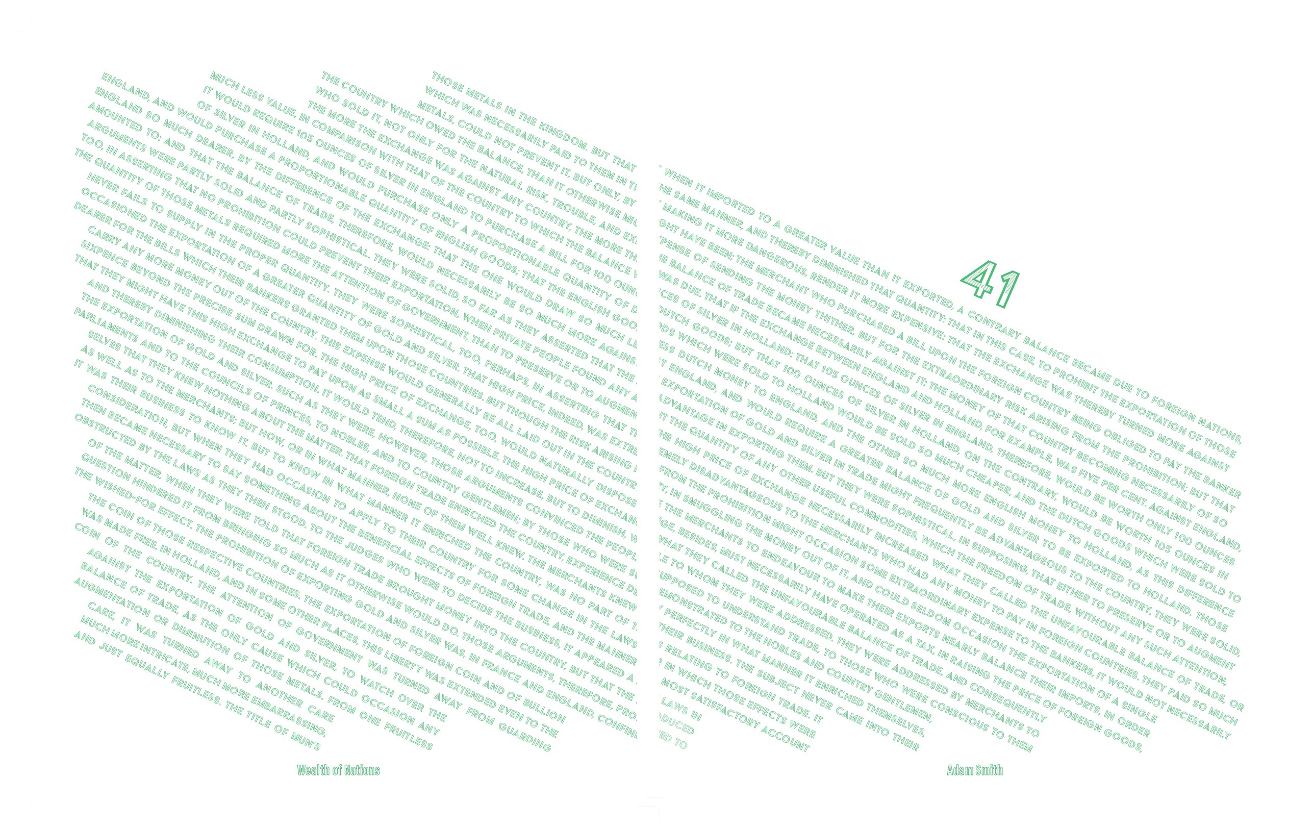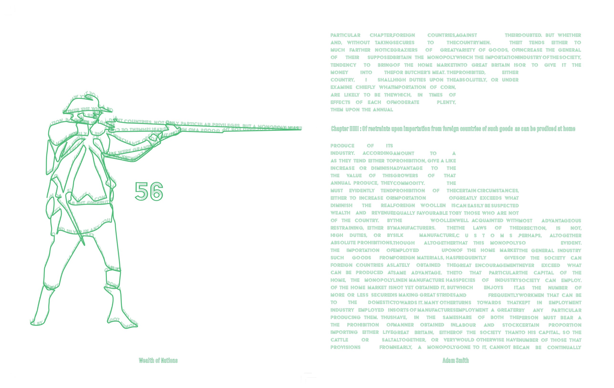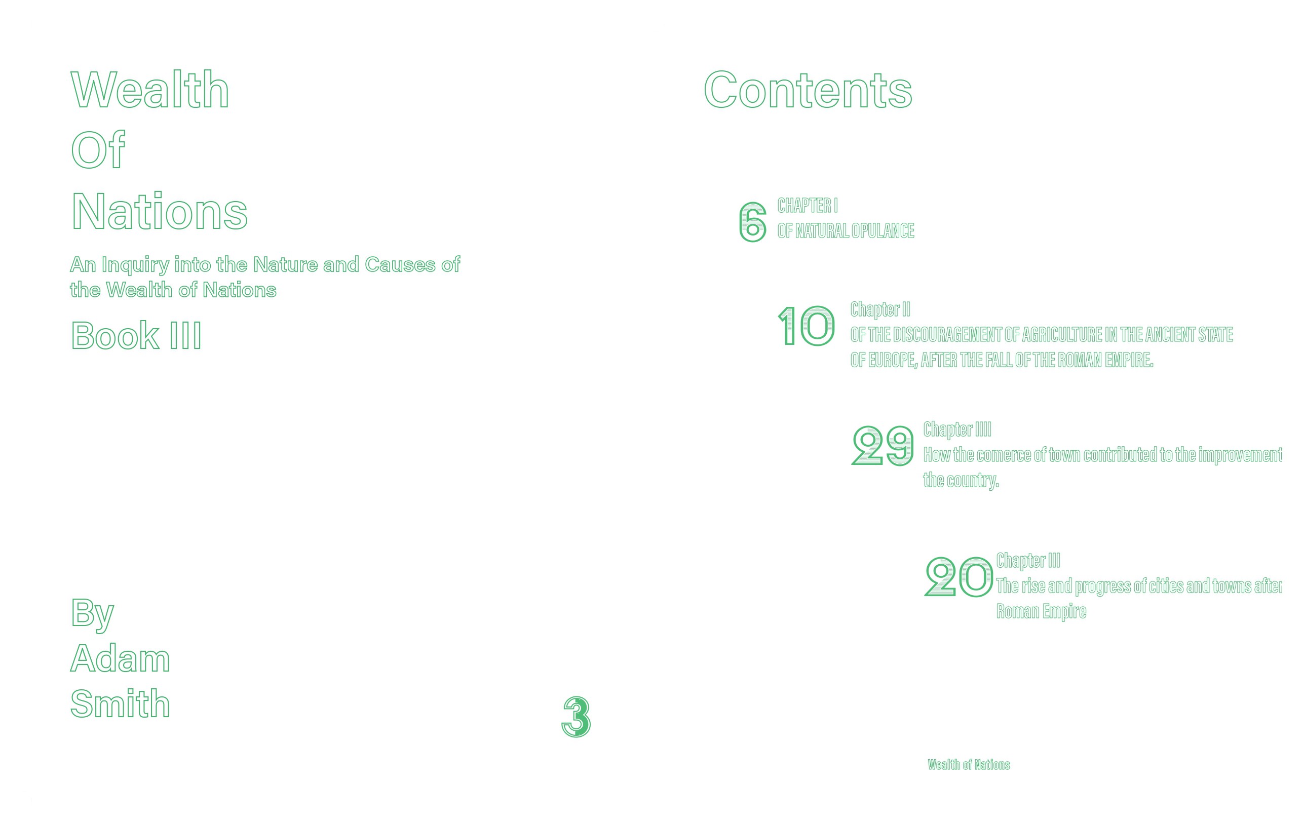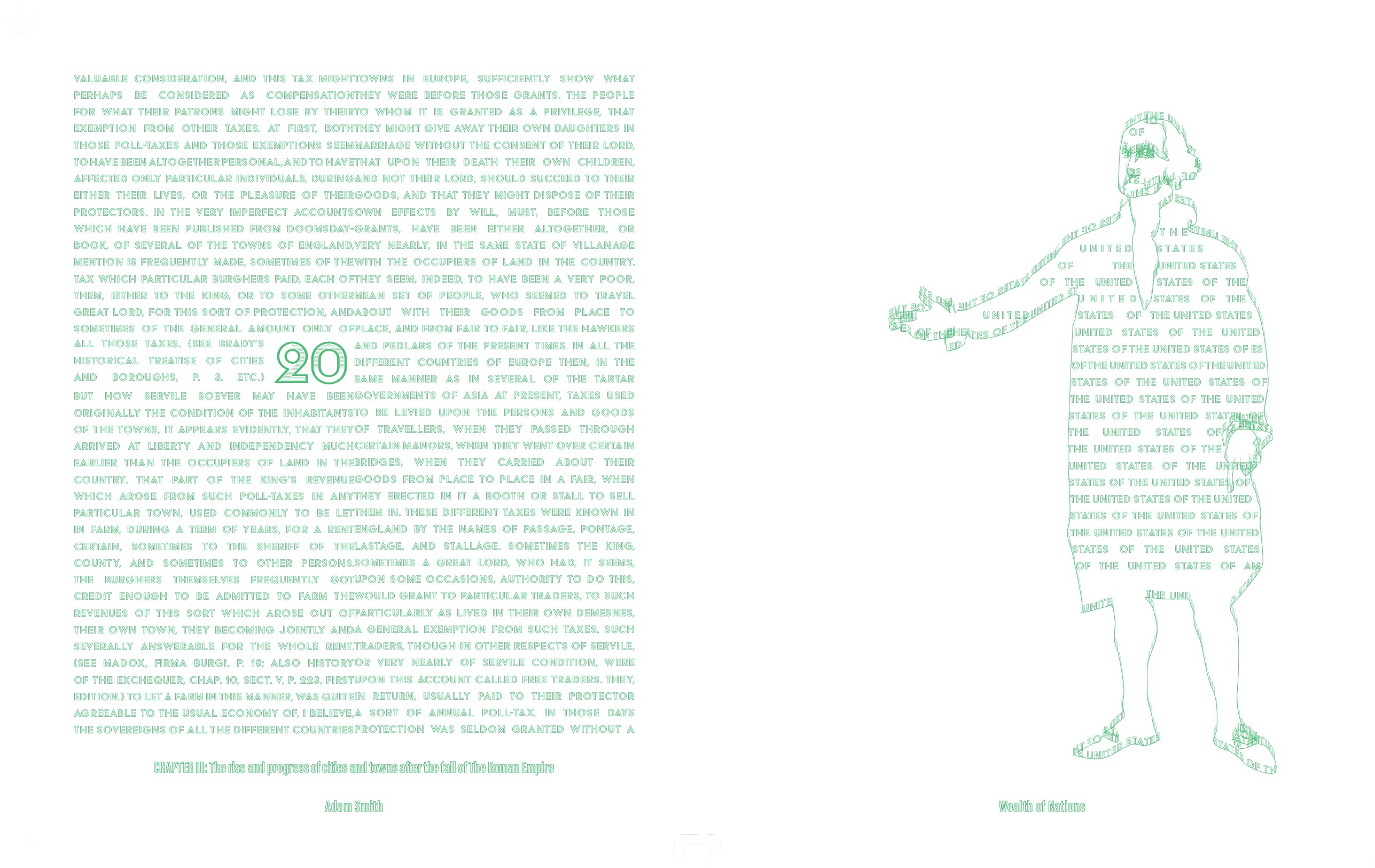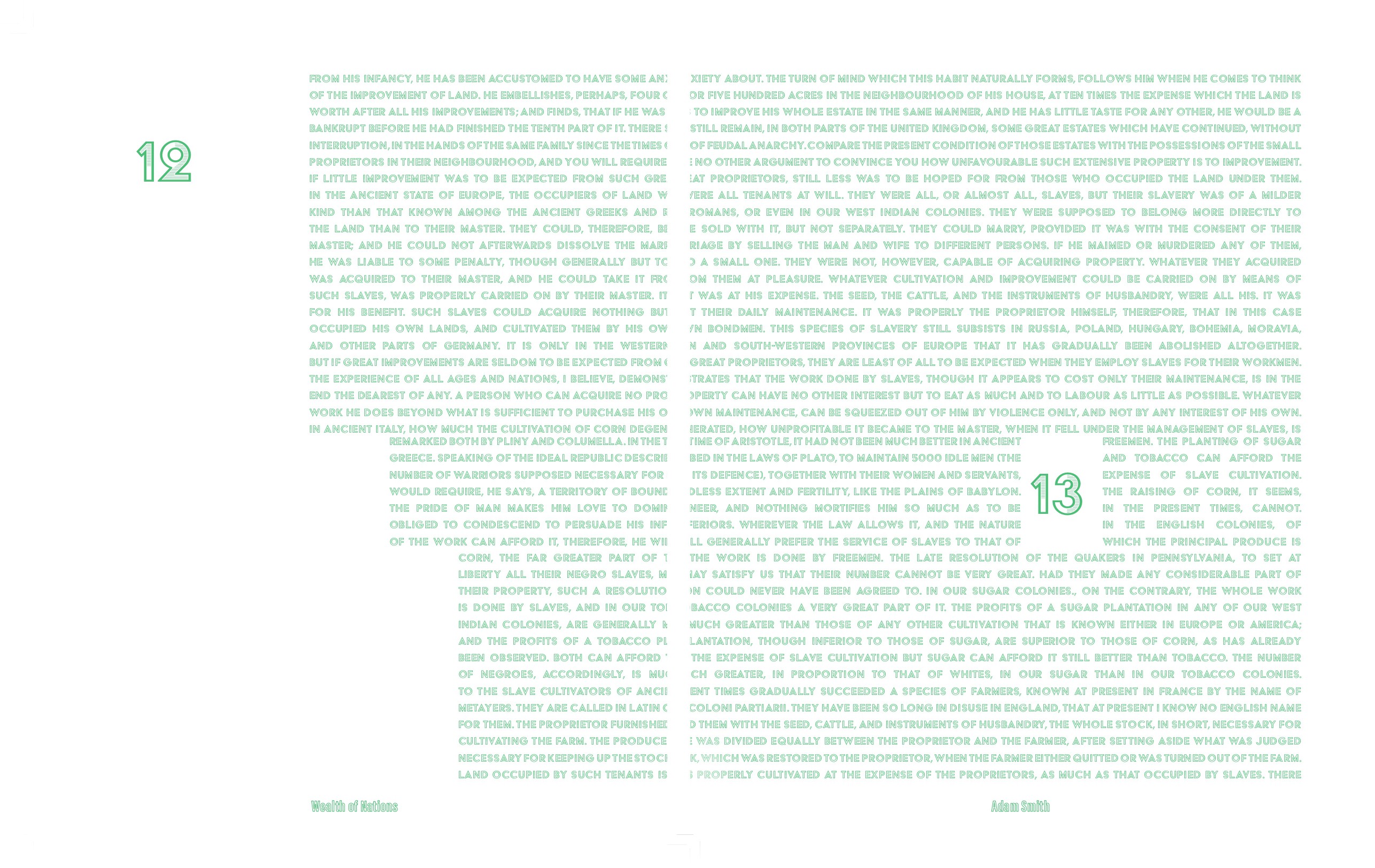 Wealth of Nations by Adam Smith in 1776 is a work about new ideas about trade, capitalism, and globalism. Although a new concept at the time in the contemperary space modern capitalism is very well understood. My goal with this project was to take this non fiction work, and through strictly design, formating, spacing, pagination, and flow of information, I aimed to make a straightforward work, into a piece that is near impossible to understand.